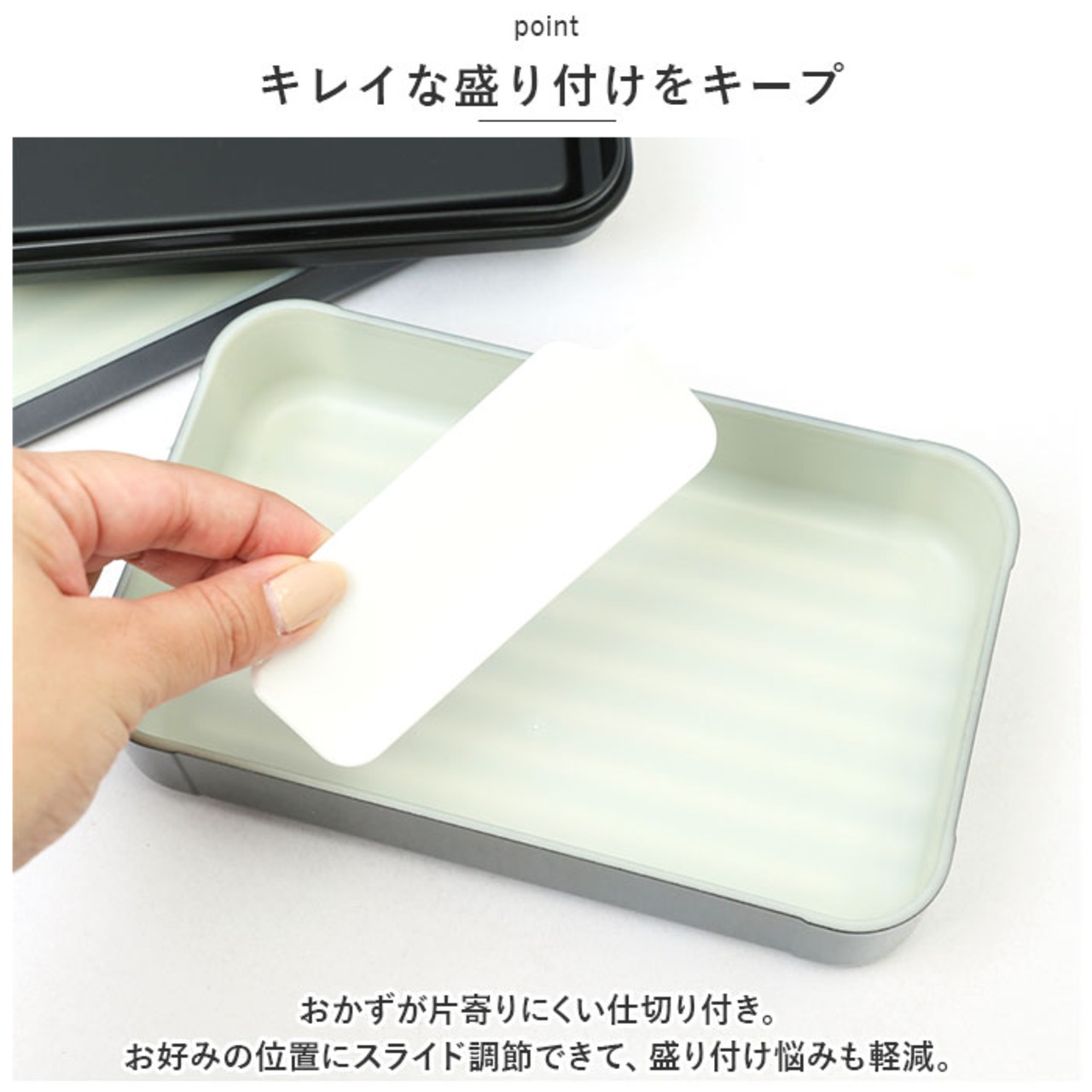 ・おかずが片寄りにくい仕切り付き。お好みの位置にスライド調節できて、盛り付け悩みも軽減。