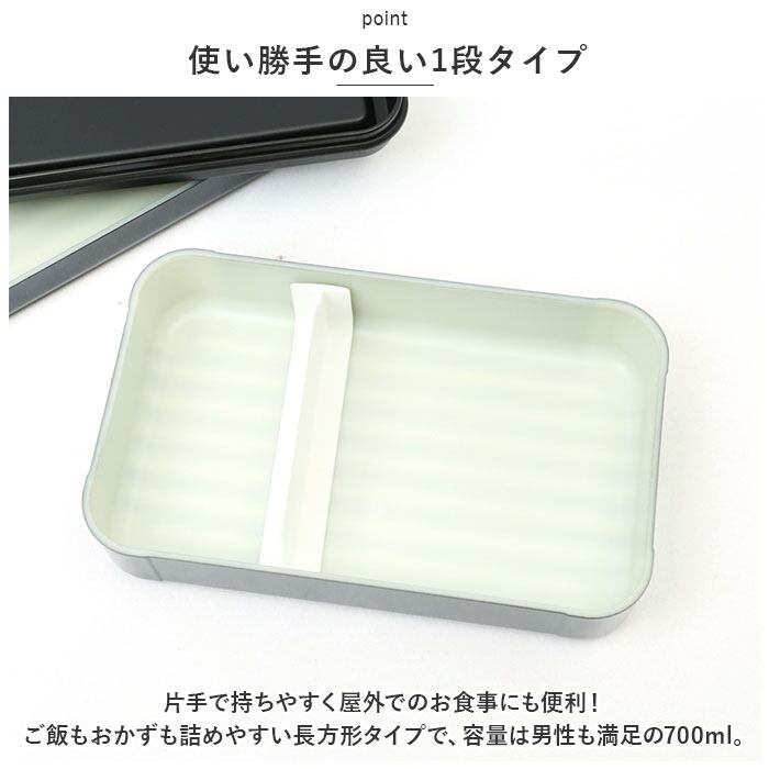 ・片手で持ちやすく屋外でのお食事にも便利!ご飯もおかずも詰めやすい長方形タイプで、容量は男性も満足の700ml。