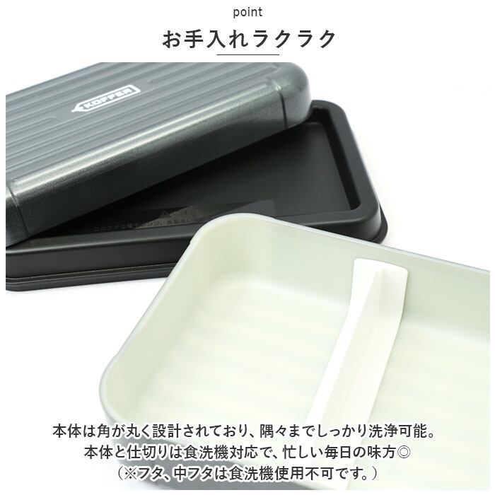 ・本体は角が丸く設計されており、隅々までしっかり洗浄可能。本体と仕切りは食洗機対応で、忙しい毎日の味方◎(※フタ、中フタは食洗機使用不可です。)