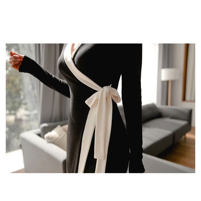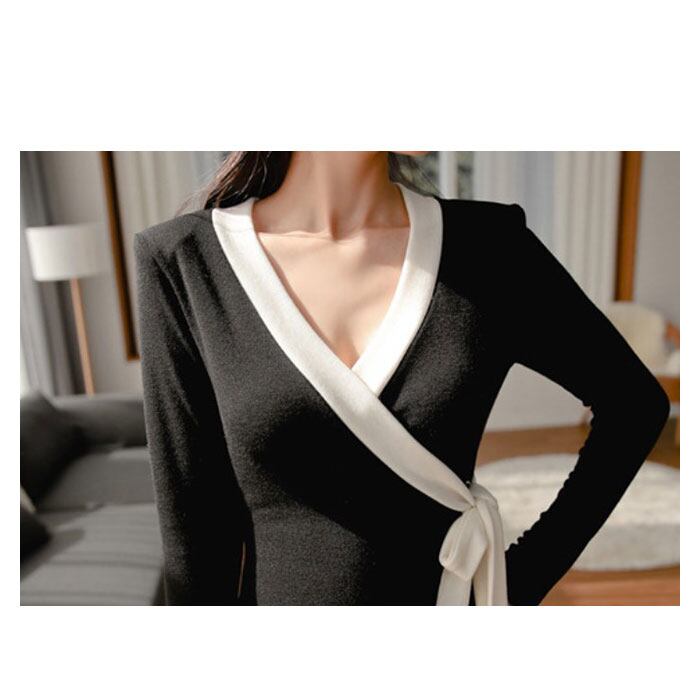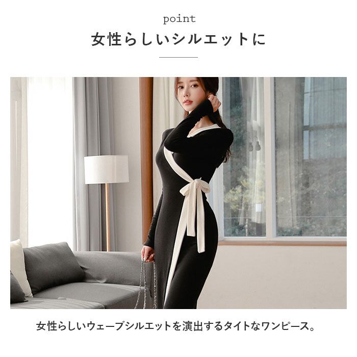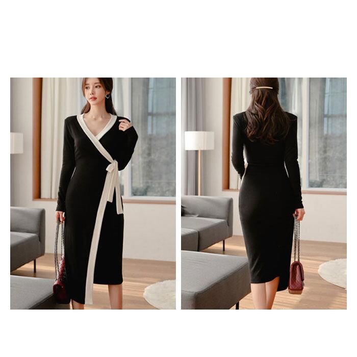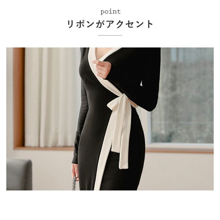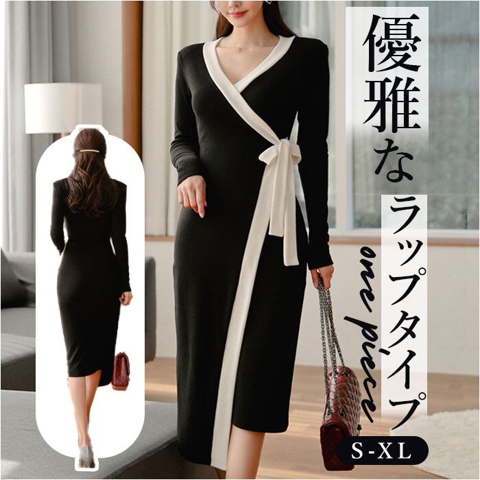 ワンピース Vネック 長袖 通販 ミモレ丈 パーティードレス ラップドレス タイト ミドル丈 長袖 スリット OL 姫系 お嬢様 おしゃれ 大人可愛い 大人 かわいい きれいめ リボン セクシー レディースファッション