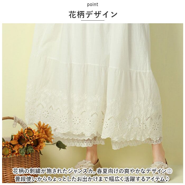 ・花柄の刺繍が施されたジャンスカ。春夏向けの爽やかなデザイン◎普段使いからちょっとしたお出かけまで幅広く活躍するアイテム♪
