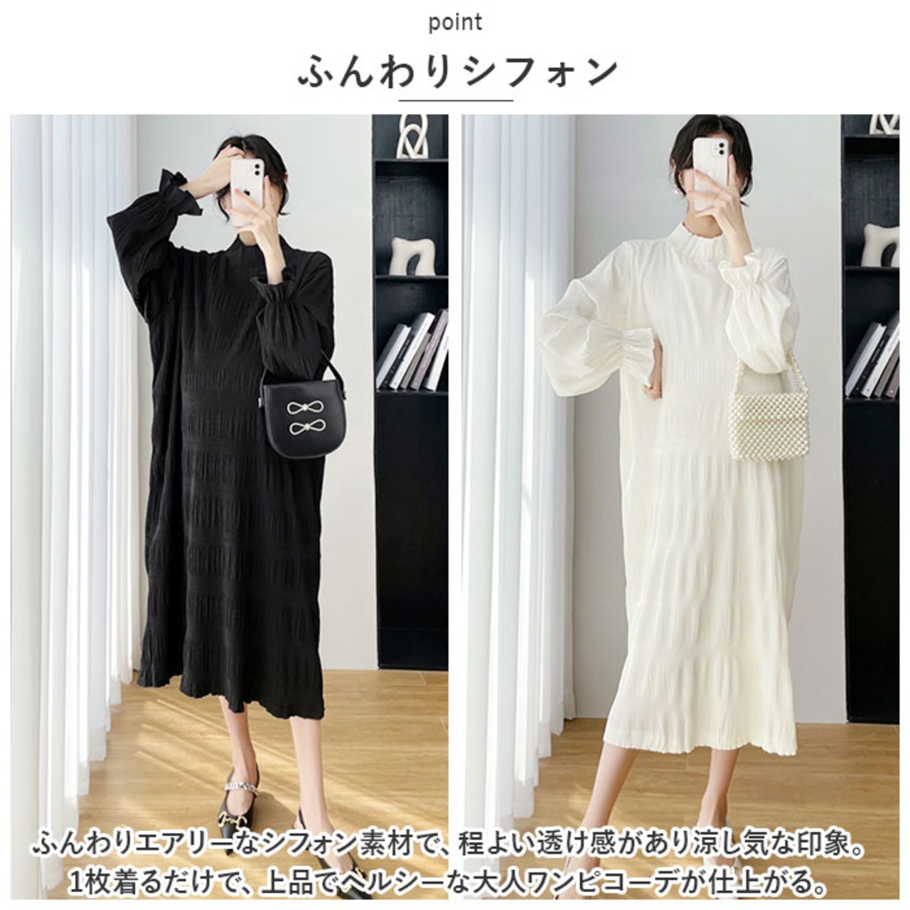 ・ふんわりエアリーなシフォン素材で、程よい透け感があり涼し気な印象。1枚着るだけで、上品でヘルシーな大人ワンピコーデが仕上がる。