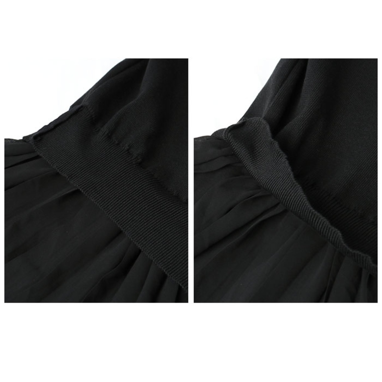 ・ニットにシフォンスカートをプラスした、斬新な切り替えデザインが魅力。異なる素材の組み合わせが新しい。1枚着るだけでOk、旬コーデが完成。