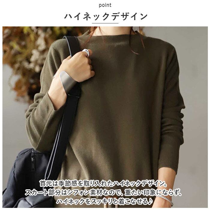 ・首元は季節感を取り入れたハイネックデザイン。スカート部分はシフォン素材なので、重たい印象にならず、ハイネックをスッキリと着こなせる♪