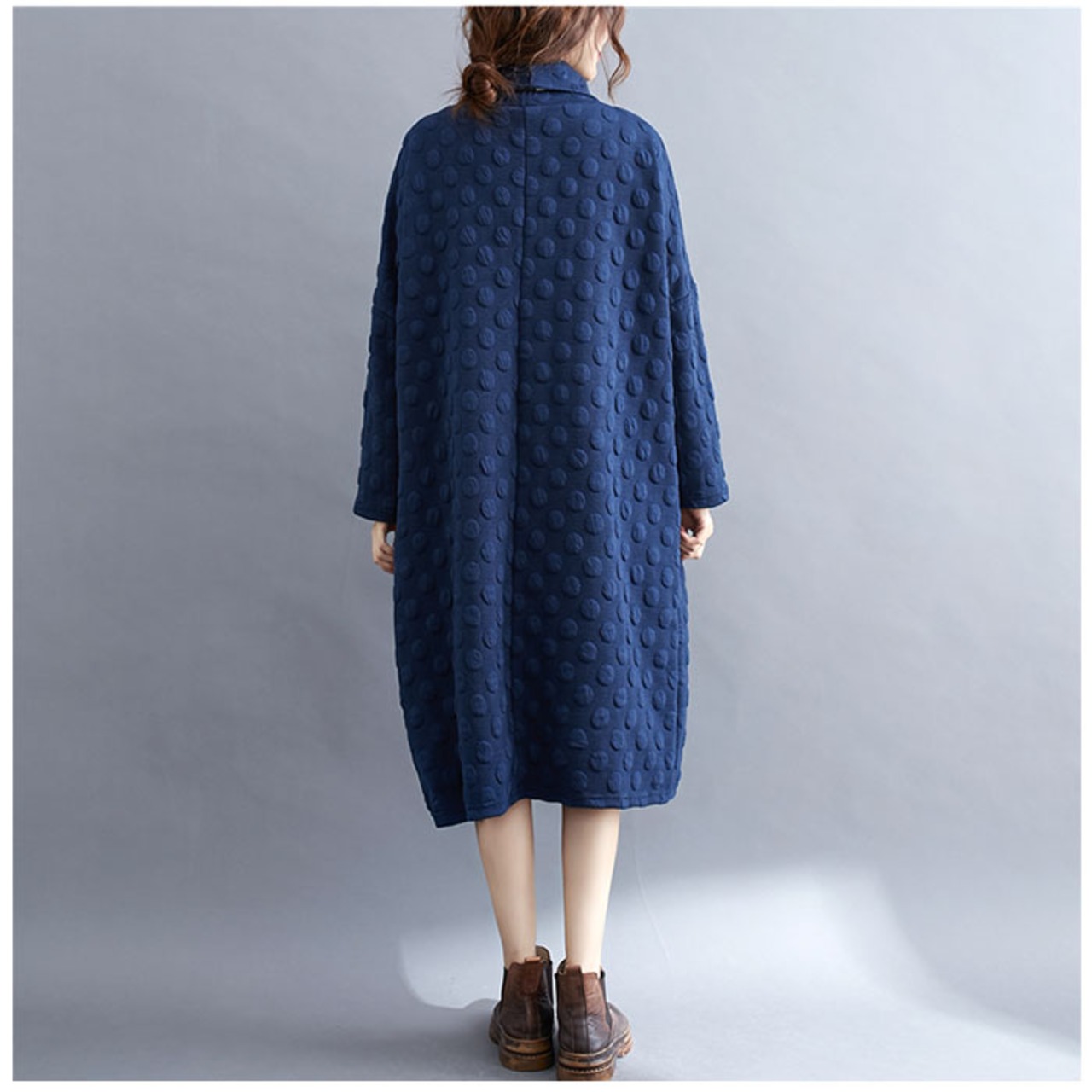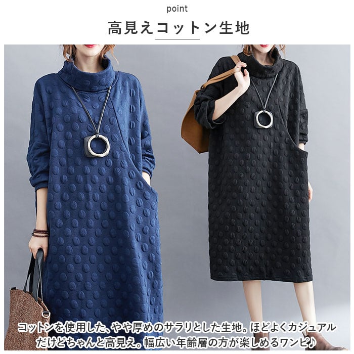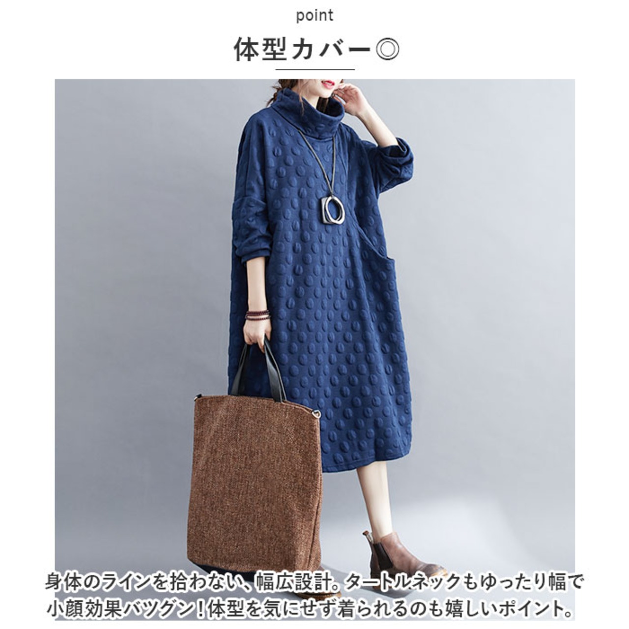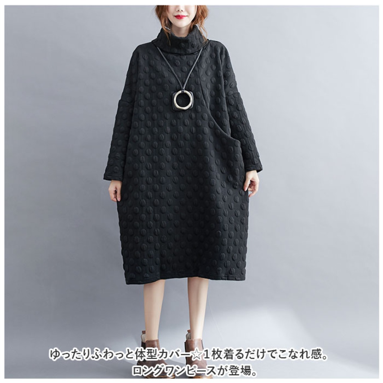 ・身体のラインを拾わない、幅広設計。タートルネックもゆったり幅で小顔効果バツグン!体型を気にせず着られるのも嬉しいポイント。