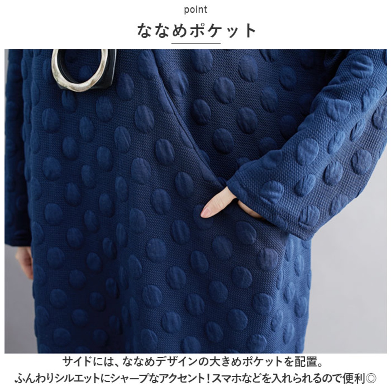 ・サイドには、ななめデザインの大きめポケットを配置。ふんわりシルエットにシャープなアクセント!スマホなどを入れられるので便利◎