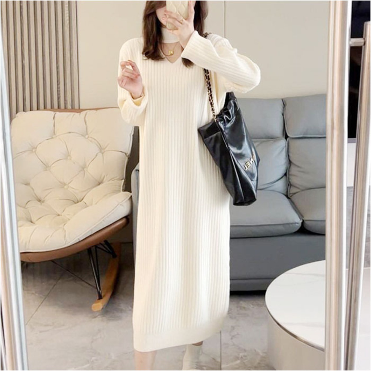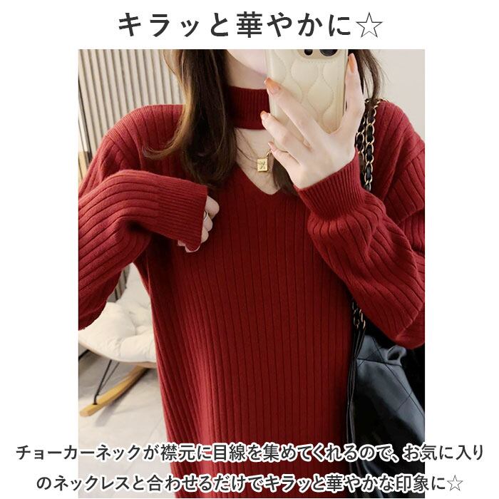 ・チョーカーネックがポイントのニットワンピ。バッチリ垢抜け感のあるデザインで、いつものワンピコーデをワンランクアップ!