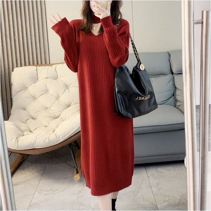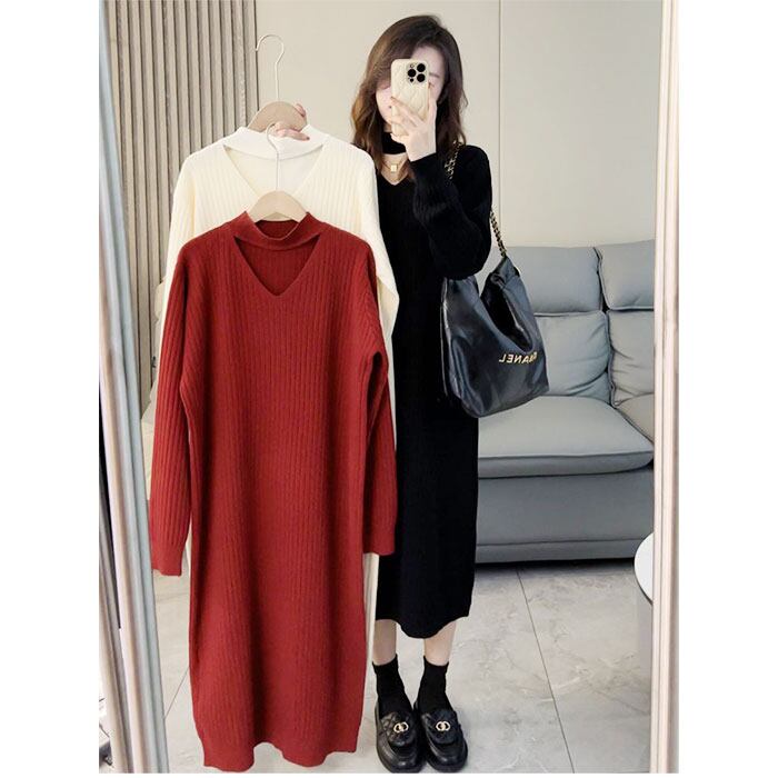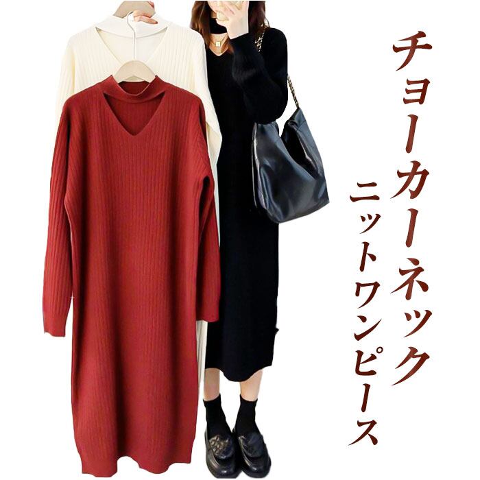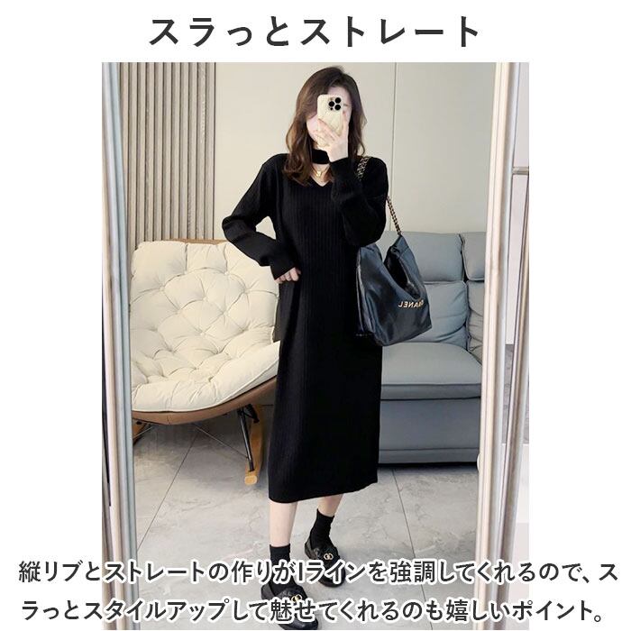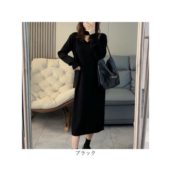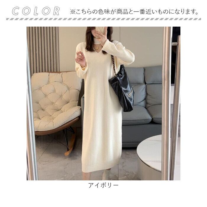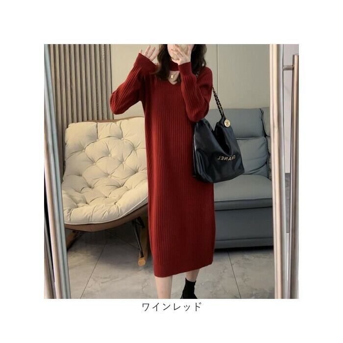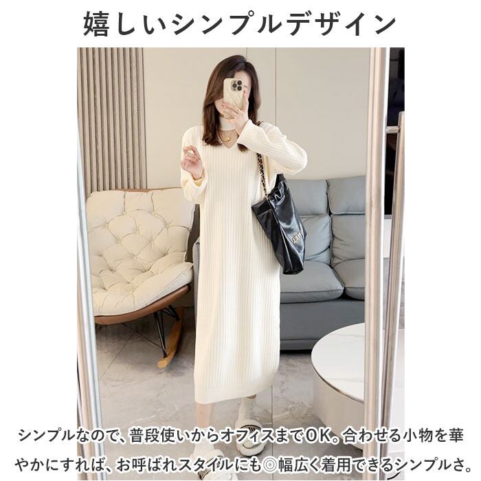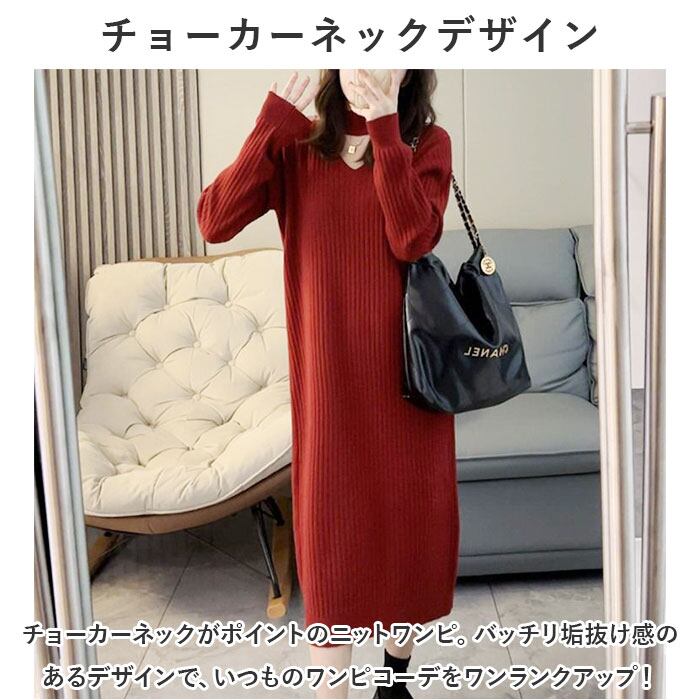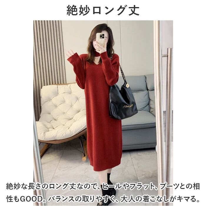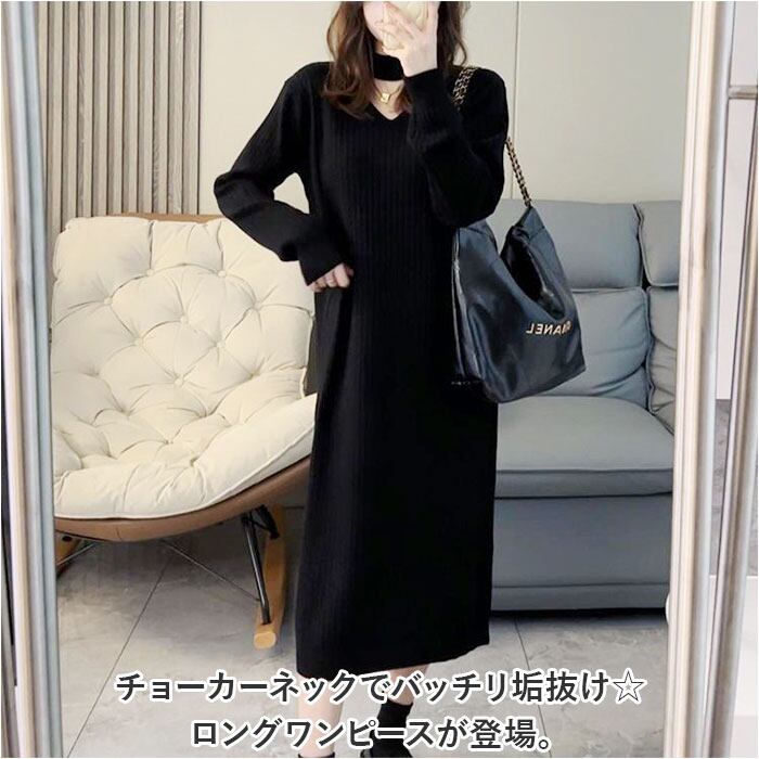 ロングワンピース 秋冬 通販 ニットワンピース ワンピース ワンピ 長袖 レディース きれいめ カジュアル ロング おしゃれ チョーカーネック Vネック Iライン シンプル 無地 通勤 通学 お出かけ お呼ばれ 大人 上品 ゆったり 体型カバー マタニティ