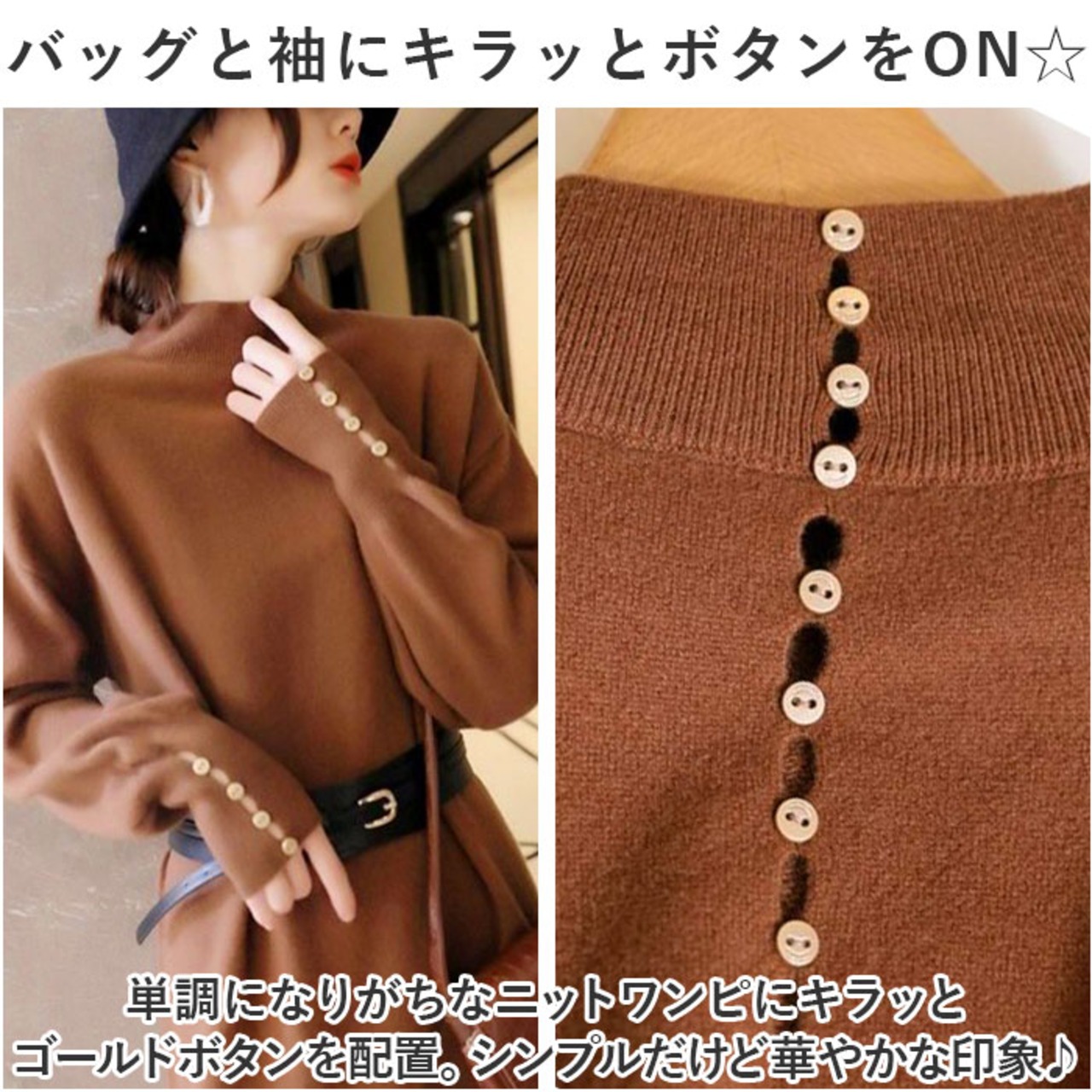 ・単調になりがちなニットワンピにキラッとゴールドボタンを配置。シンプルだけど華やかな印象♪