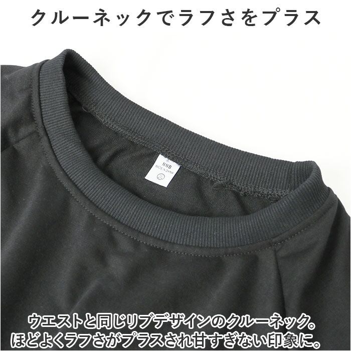 ・ウエストと同じリブデザインのクルーネック。ほどよくラフさがプラスされ甘すぎない印象に。