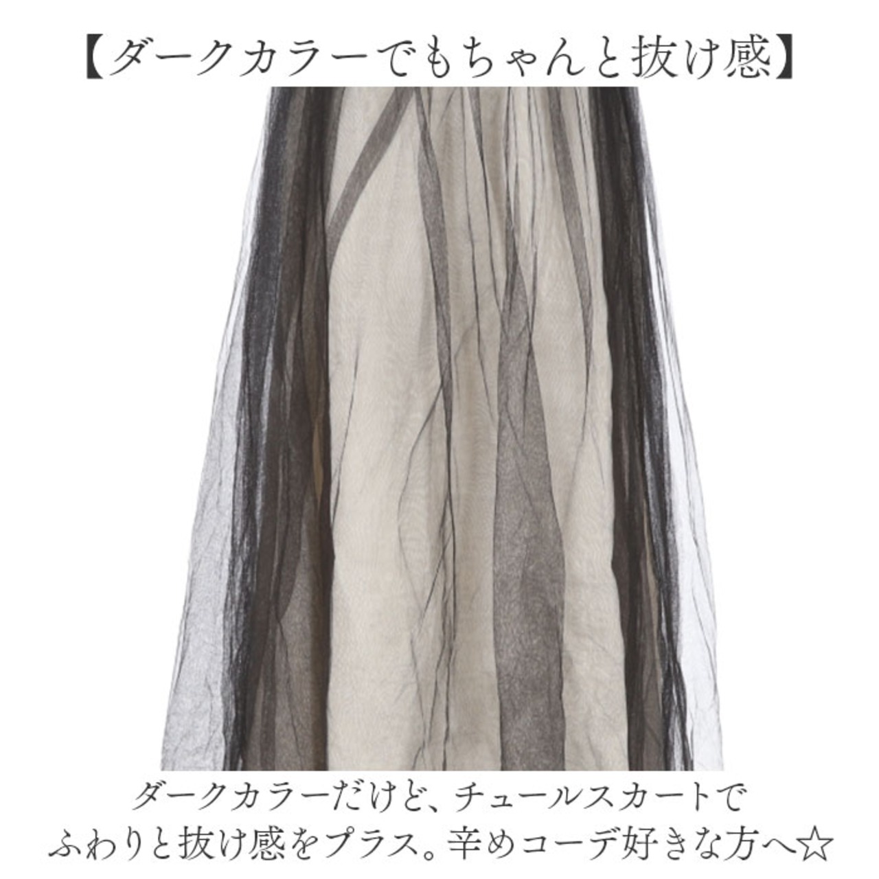 ・ダークカラーだけど、チュールスカートでふわりと抜け感をプラス。辛めコーデ好きな方へ☆