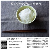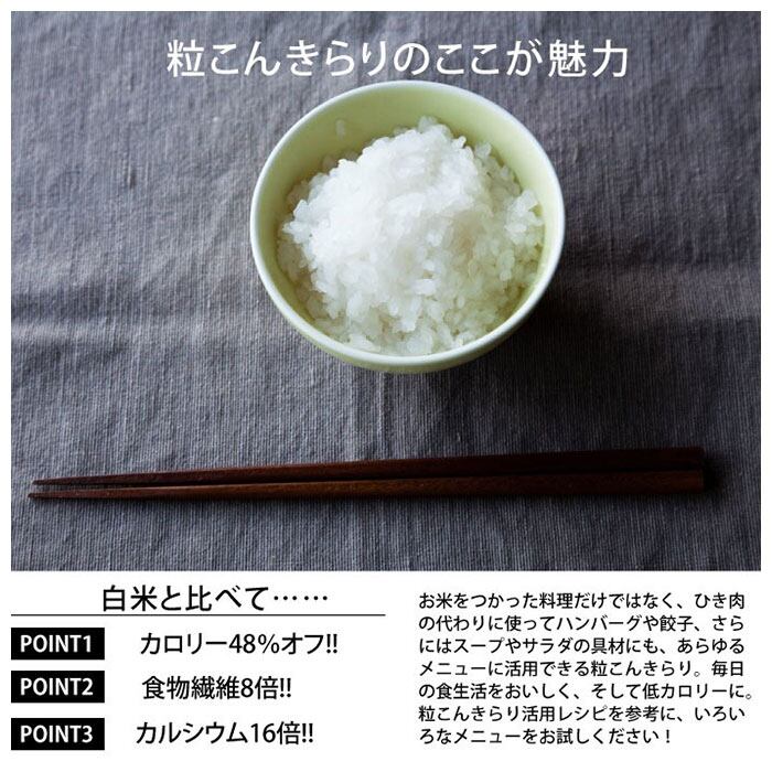 ・白米に混ぜて炊飯器で炊くだけ!炊きあがった粒こんきらりは、同量の白米と比べてカロリーは48%カット、食物繊維は8倍、カルシウムは16倍!