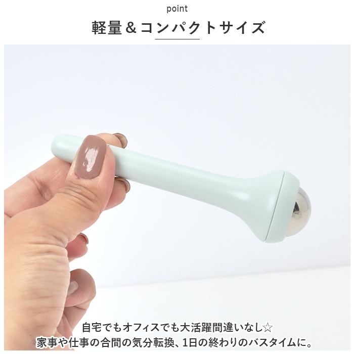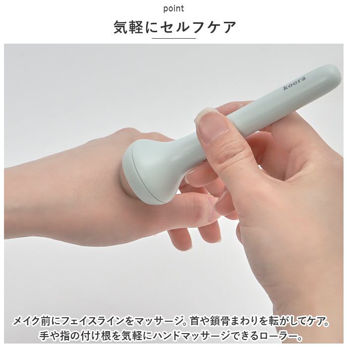 ・メイク前にフェイスラインをマッサージ。首や鎖骨まわりを転がしてケア。手や指の付け根を気軽にハンドマッサージできるローラー。