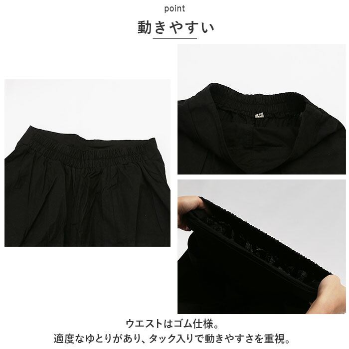 ・ウエストはゴム仕様。適度なゆとりがあり、タック入りで動きやすさを重視。