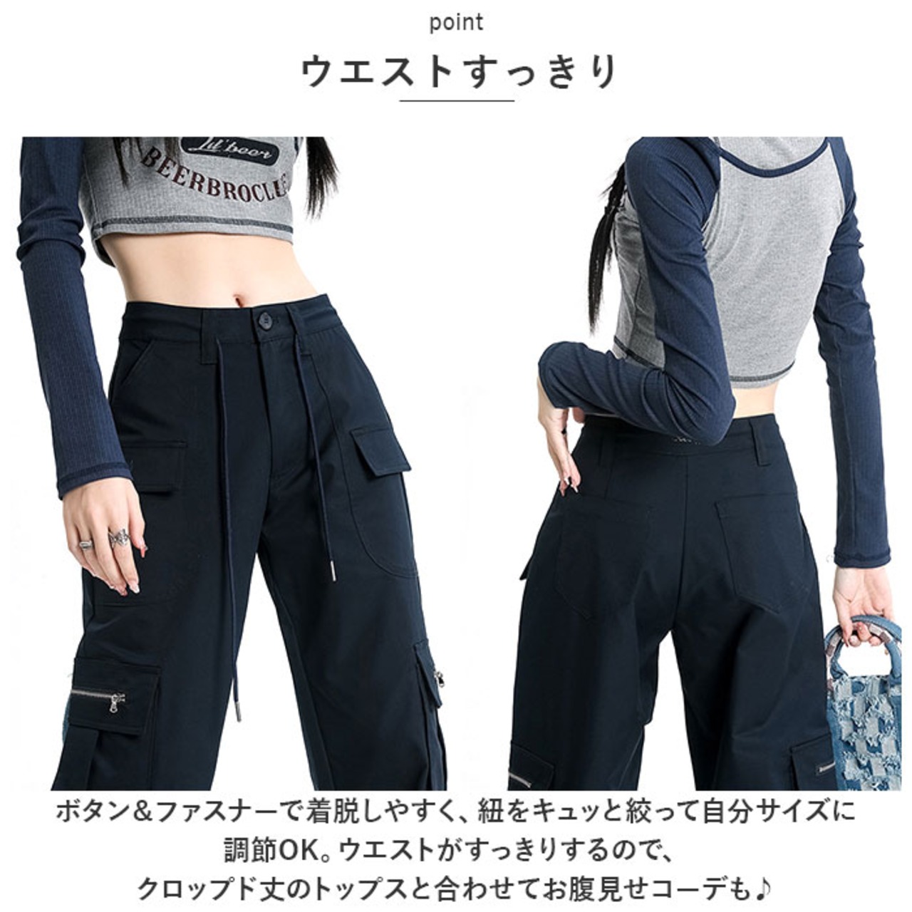 ・ボタン&ファスナーで着脱しやすく、紐をキュッと絞って自分サイズに調節OK。ウエストがすっきりするので、クロップド丈のトップスと合わせてお腹見せコーデも♪