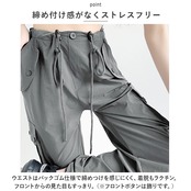 ・ウエストはバックゴム仕様で締めつけを感じにくく、着脱もラクチン。フロントからの見た目もすっきり。(※フロントボタンは飾りです。)