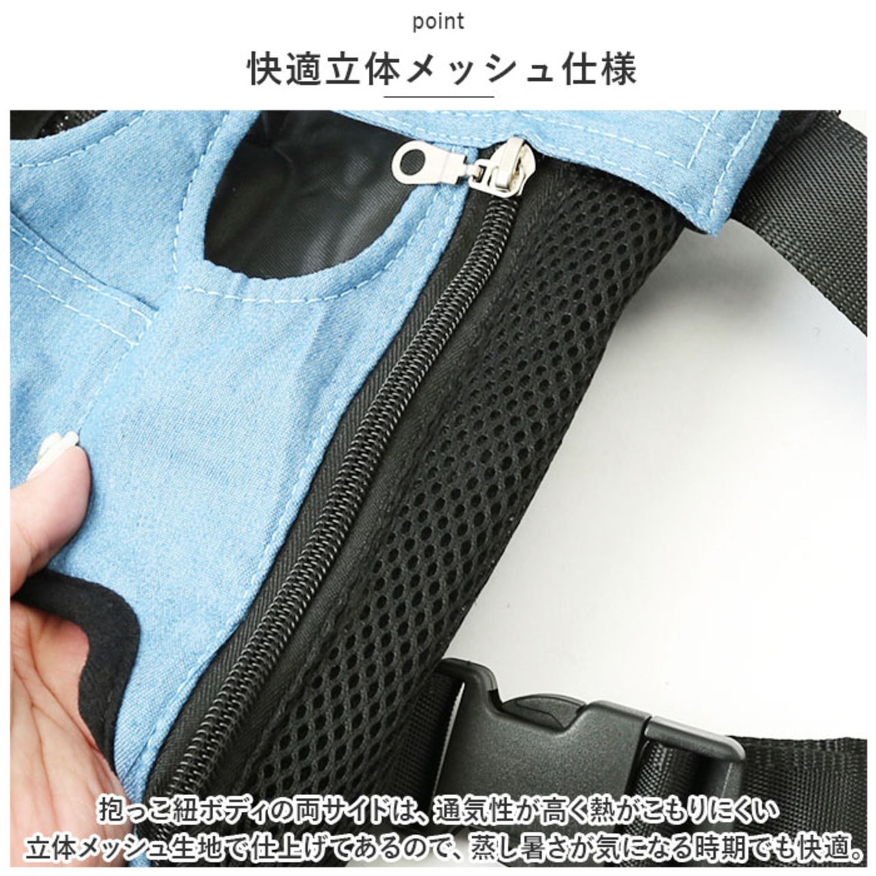 ・抱っこ紐ボディの両サイドは、通気性が高く熱がこもりにくい立体メッシュ生地で仕上げてあるので、蒸し暑さが気になる時期でもワンちゃん快適。