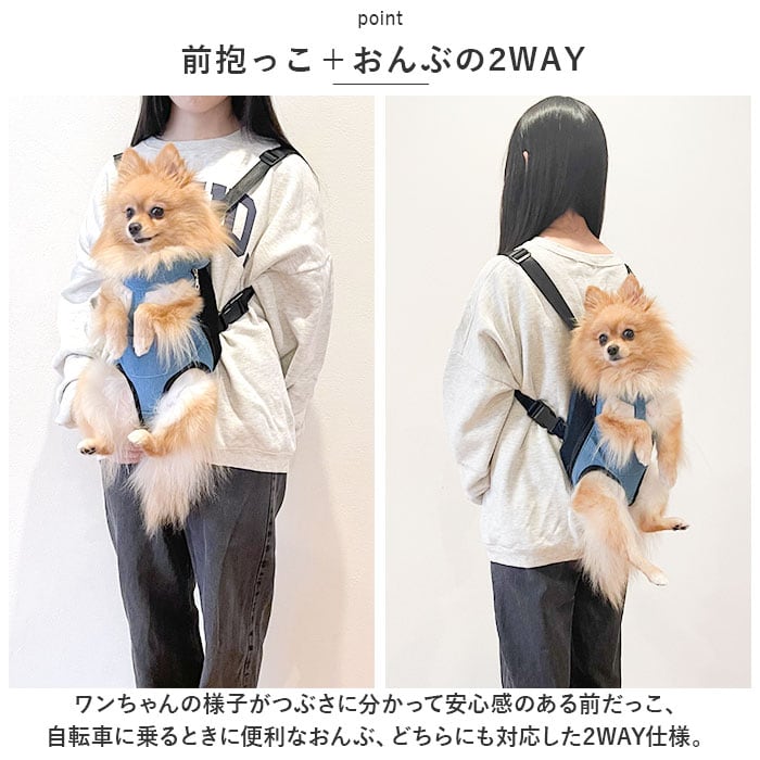 ・ワンちゃんの様子がつぶさに分かって安心感のある前だっこ、自転車に乗るときに便利なおんぶ、どちらにも対応した2WAY仕様。