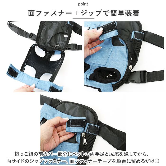 ・抱っこ紐の前カバー部分にペットの両手足と尻尾を通してから、両サイドのジップファスナー、面ファスナーテープを順番に留めるだけで装着スムーズ。