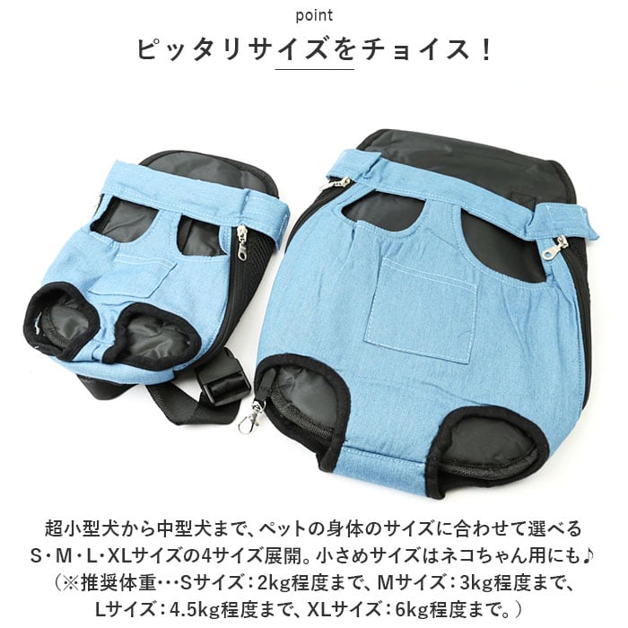※超小型犬から中型犬まで、ペットの身体のサイズに合わせて選べるS・M・L・XLサイズの4サイズ展開。小さめサイズはネコちゃん用にも♪(※推奨体重・・・Sサイズ:2kg程度まで、Mサイズ:3kg程度まで、Lサイズ:4.5kg程度まで、XLサイズ:6kg程度まで。)