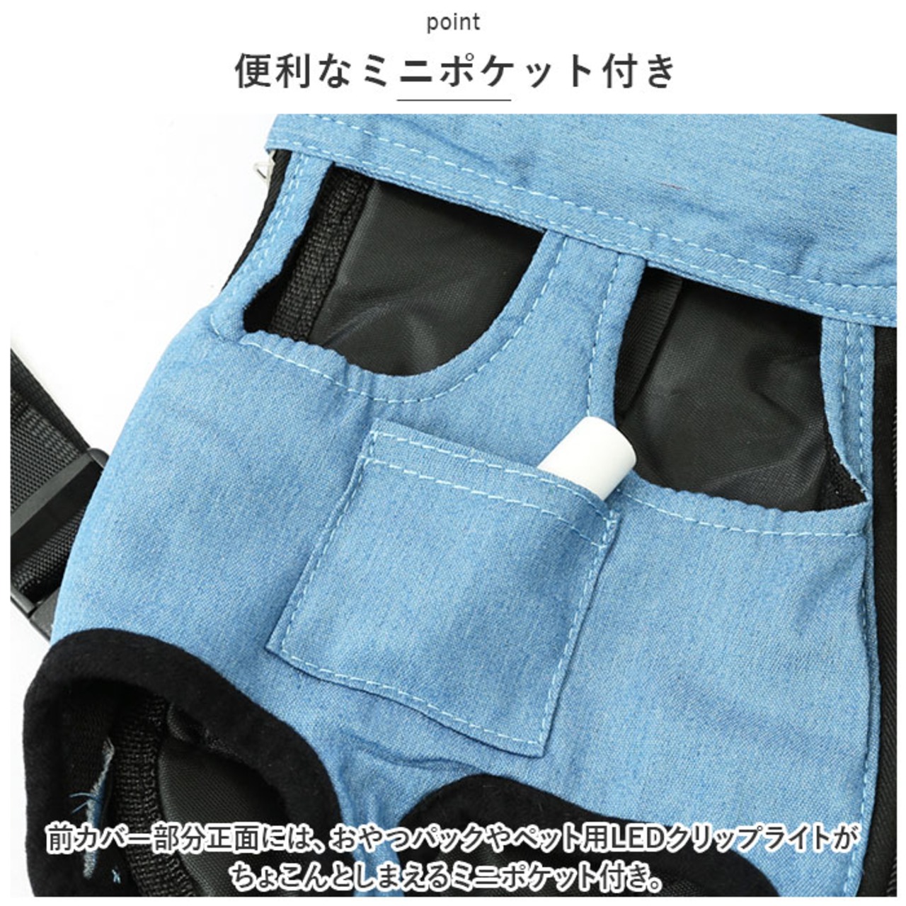 ・前カバー部分正面には、おやつパックやペット用LEDクリップライトがちょこんとしまえるミニポケット付き。