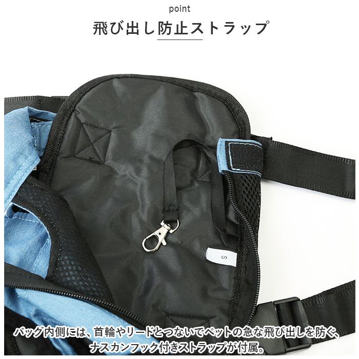 ・バッグ内側には、首輪やリードとつないでペットの急な飛び出しを防ぐ、ナスカンフック付きストラップが付属。
