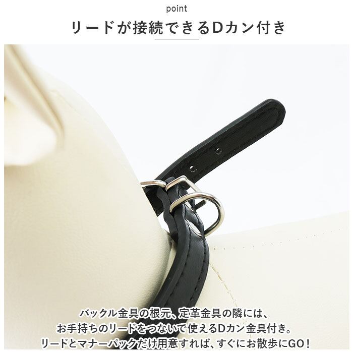 ・バックル金具の根元、定革金具の隣には、お手持ちのリードをつないで使えるDカン金具付き。リードとマナーパックだけ用意すれば、すぐにお散歩にGO!