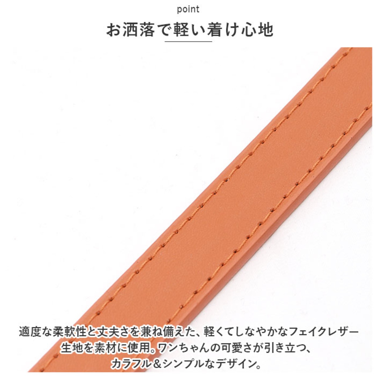 ・適度な柔軟性と丈夫さを兼ね備えた、軽くてしなやかなフェイクレザー生地を素材に使用。ワンちゃんの可愛さが引き立つ、カラフル&シンプルなデザイン。