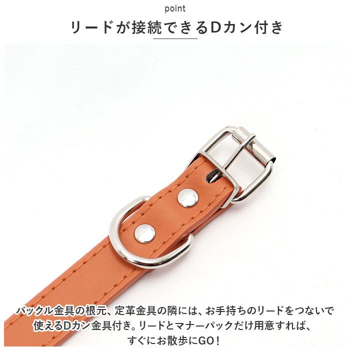 ・バックル金具の根元、定革金具の隣には、お手持ちのリードをつないで使えるDカン金具付き。リードとマナーパックだけ用意すれば、すぐにお散歩にGO!