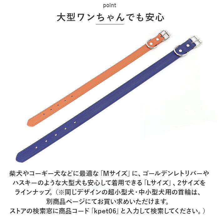 ・柴犬やコーギー犬などに最適な「Mサイズ」に、ゴールデンレトリバーやハスキーのような大型犬も安心して着用できる「Lサイズ」、2サイズをラインナップ。(※同じデザインの超小型犬・中小型犬用の首輪は、別商品ページにてお買い求めいただけます。ストアの検索窓に商品コード「kpet06」と入力して検索してください。)