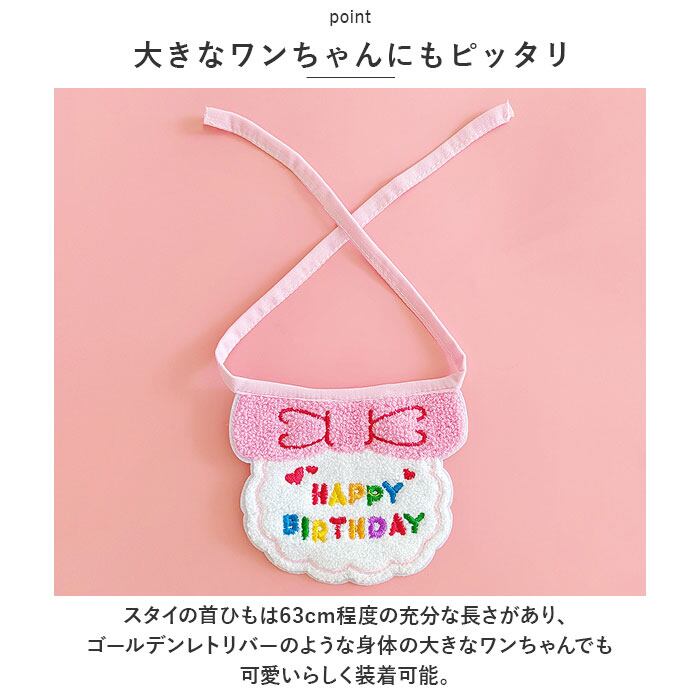 ・柔らかなフェルト生地に、サガラ刺しゅうでモコモコの優しい肌触りに仕上げた、可愛らしいペット用スタイ。レインボーカラーの「HAPPY BIRTHDAY」の刺しゅうがインパクト抜群!
