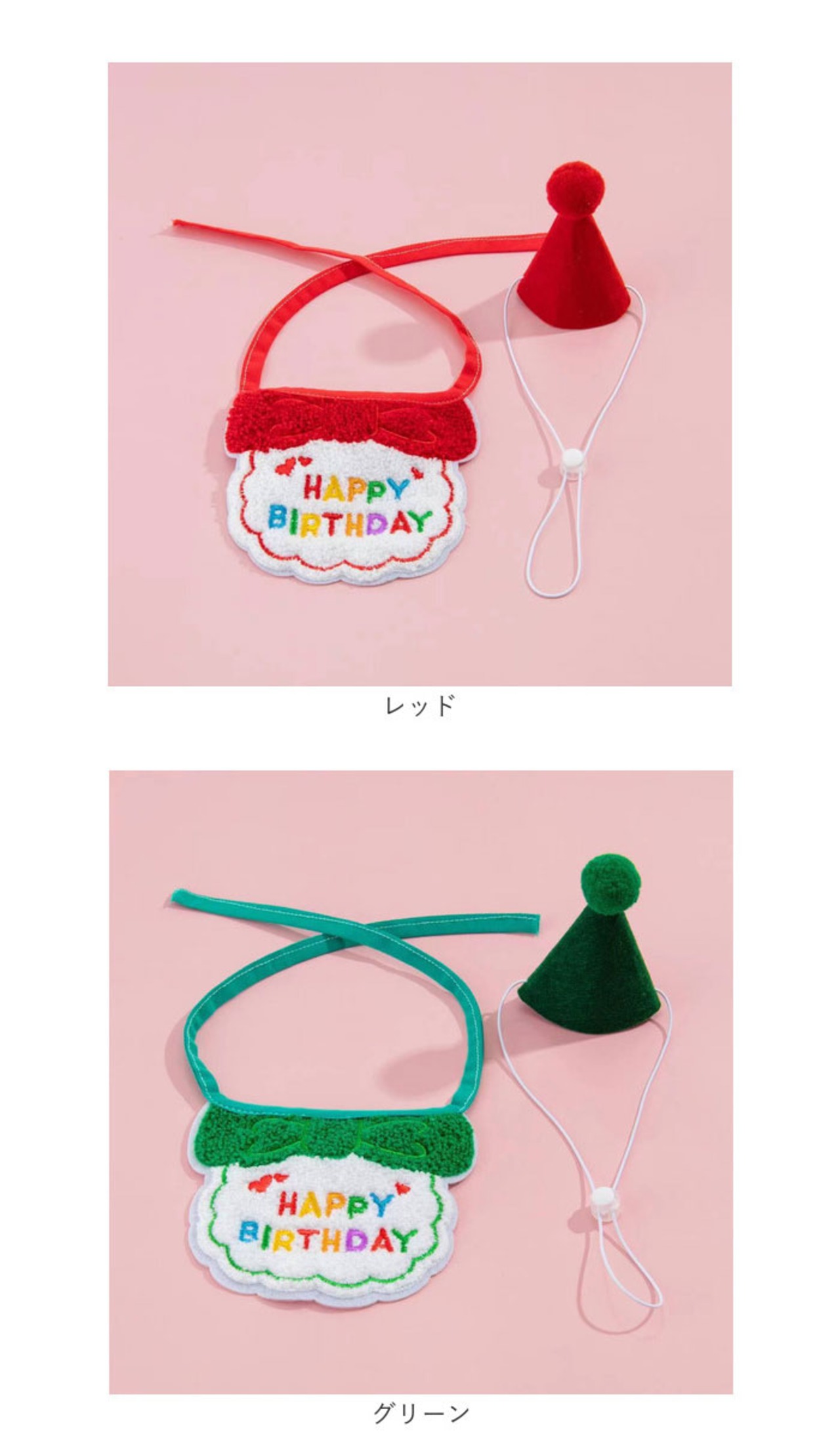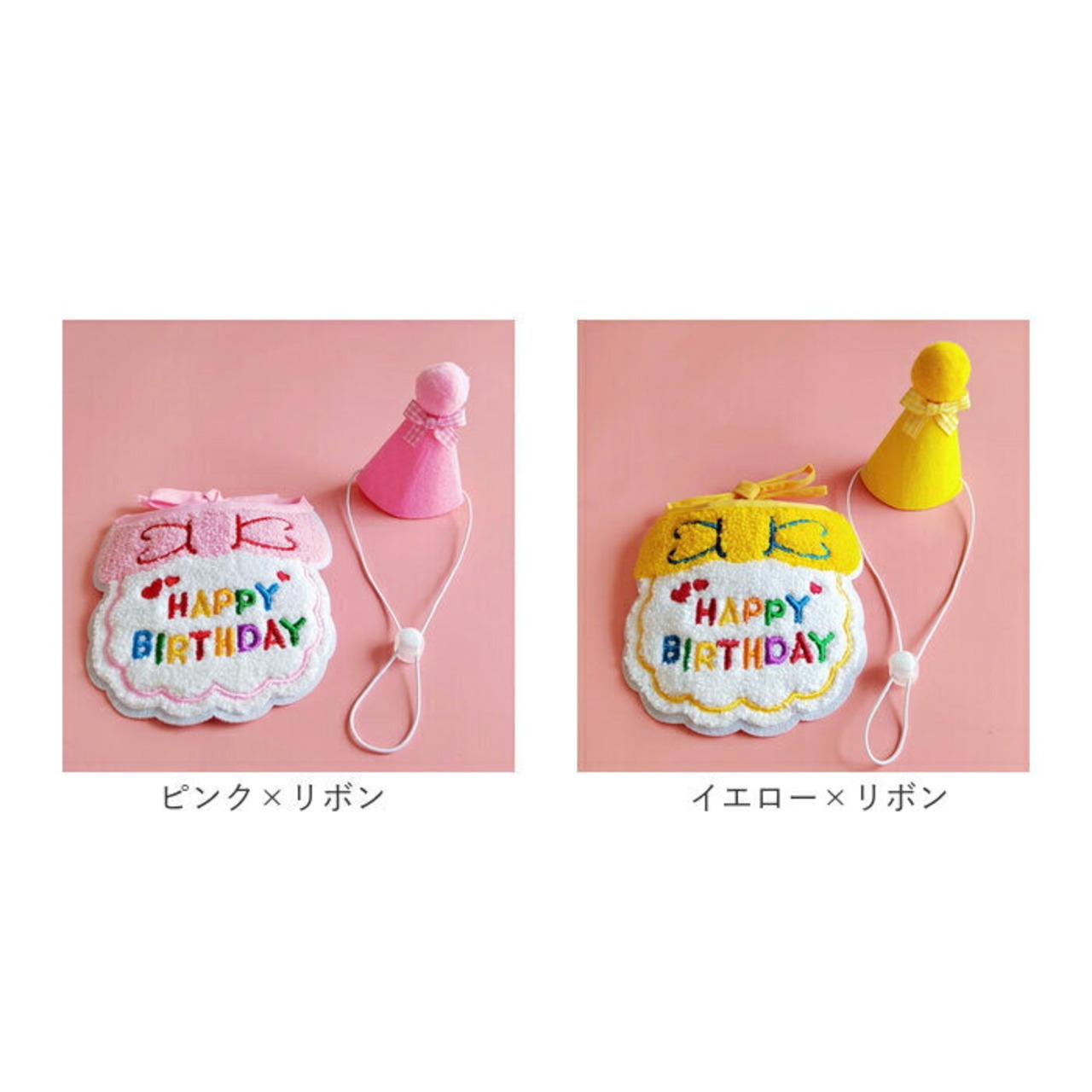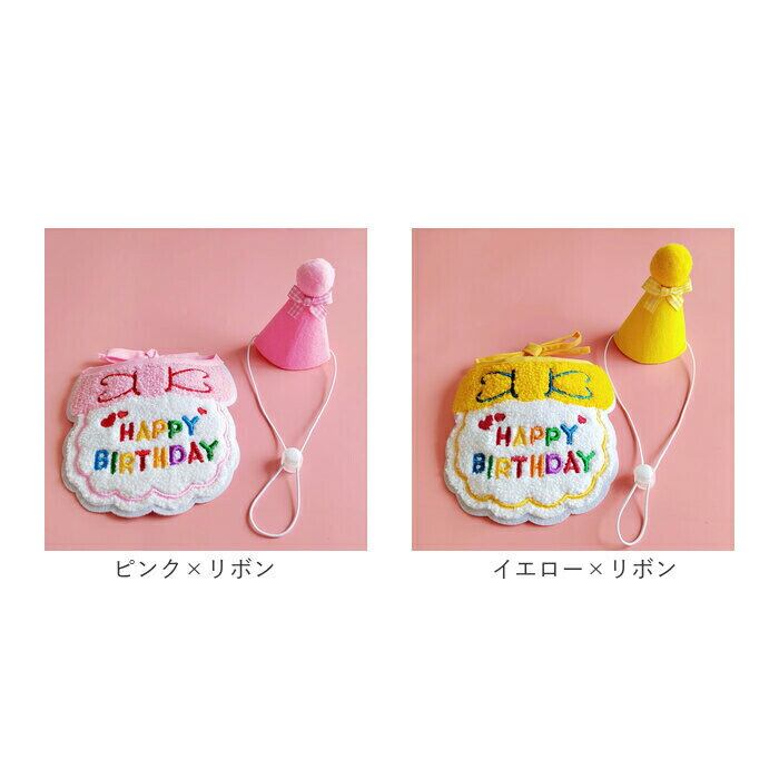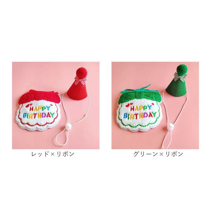 ・「HAPPY BIRTHDAY」の刺しゅうをあしらったリボン風スタイ(よだれかけ)と、ミニミニ三角帽子の2点セット。