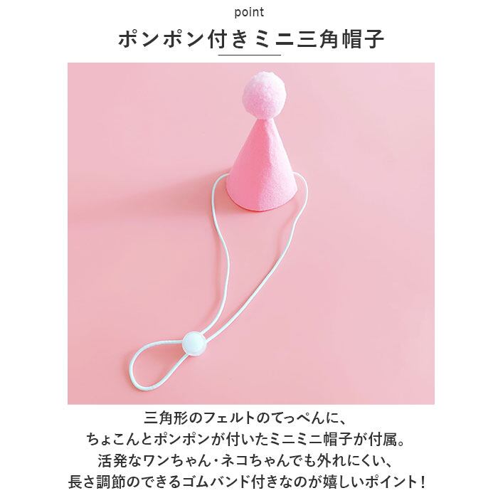 ・三角形のフェルトのてっぺんに、ちょこんとポンポンが付いたミニミニ帽子が付属。活発なワンちゃん・ネコちゃんでも外れにくい、長さ調節のできるゴムバンド付きなのが嬉しいポイント!