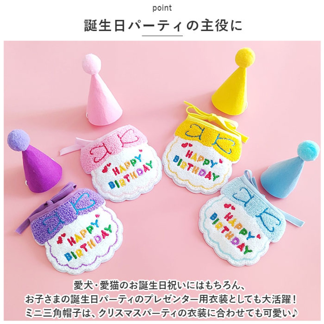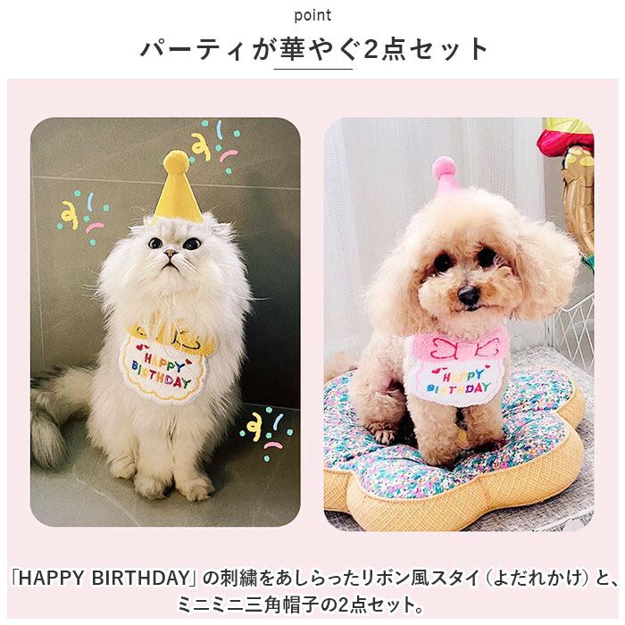 ・愛犬・愛猫のお誕生日祝いにはもちろん、お子さまの誕生日パーティのプレゼンター用衣装としても大活躍!ミニ三角帽子は、クリスマスパーティの衣装に合わせても可愛い♪