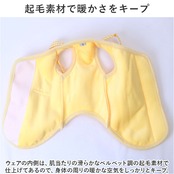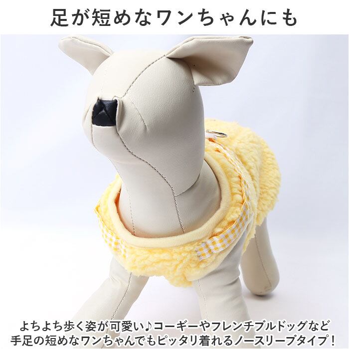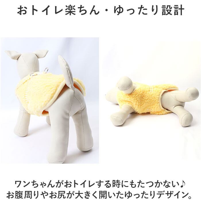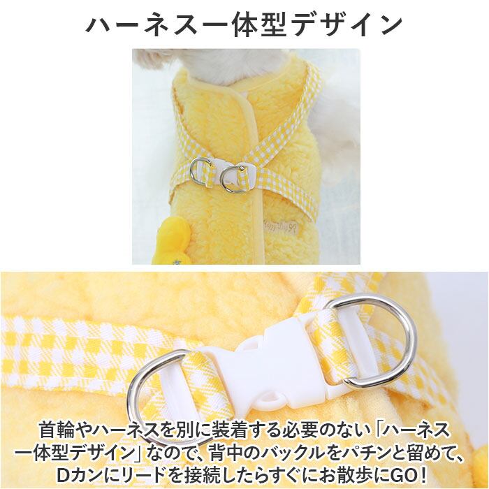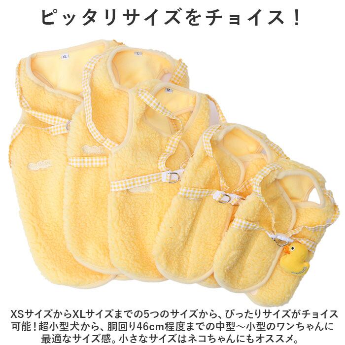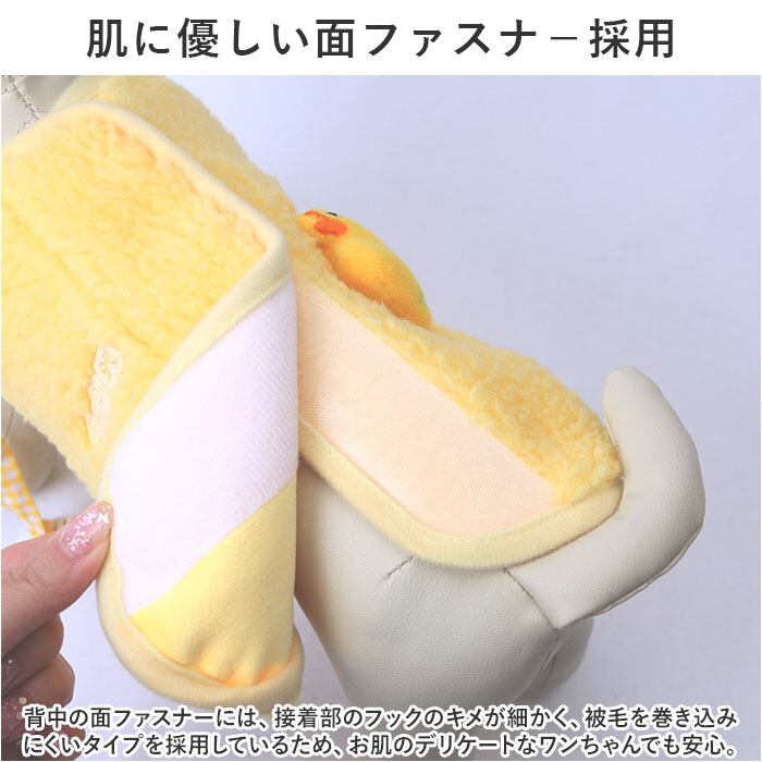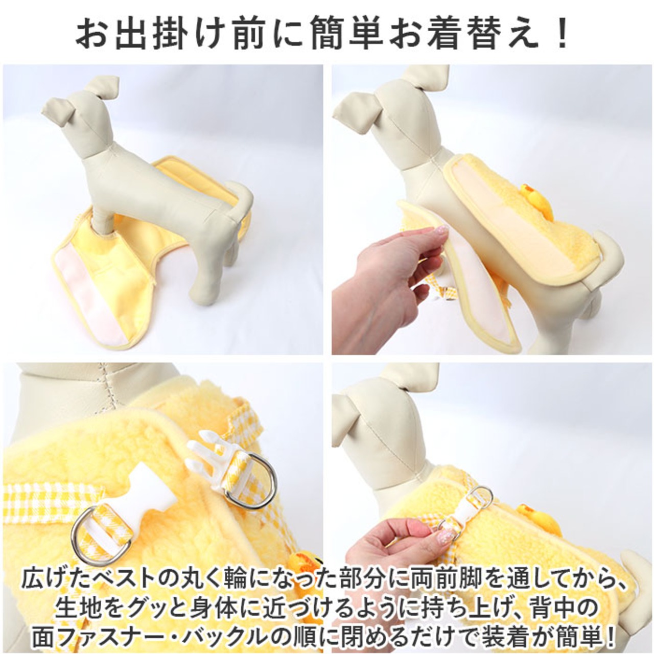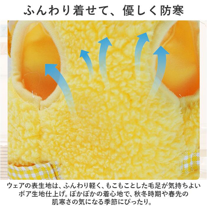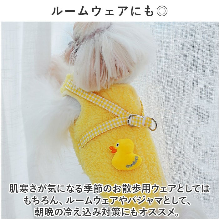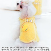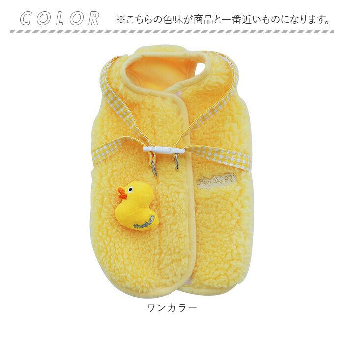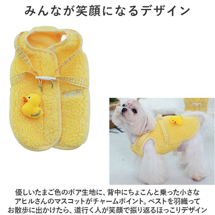 ・優しいたまご色のボア生地に、背中にちょこんと乗った小さなアヒルさんのマスコットがチャームポイント。ベストを羽織ってお散歩に出かけたら、道行く人が笑顔で振り返るほっこりデザイン。