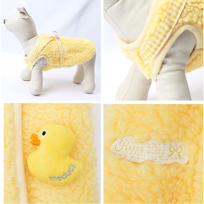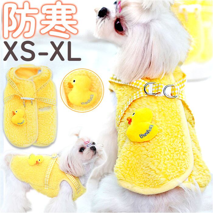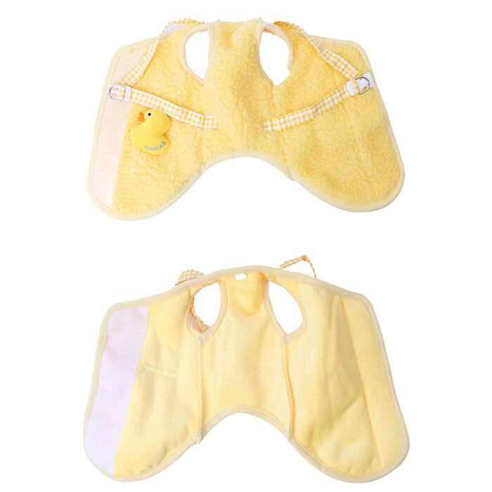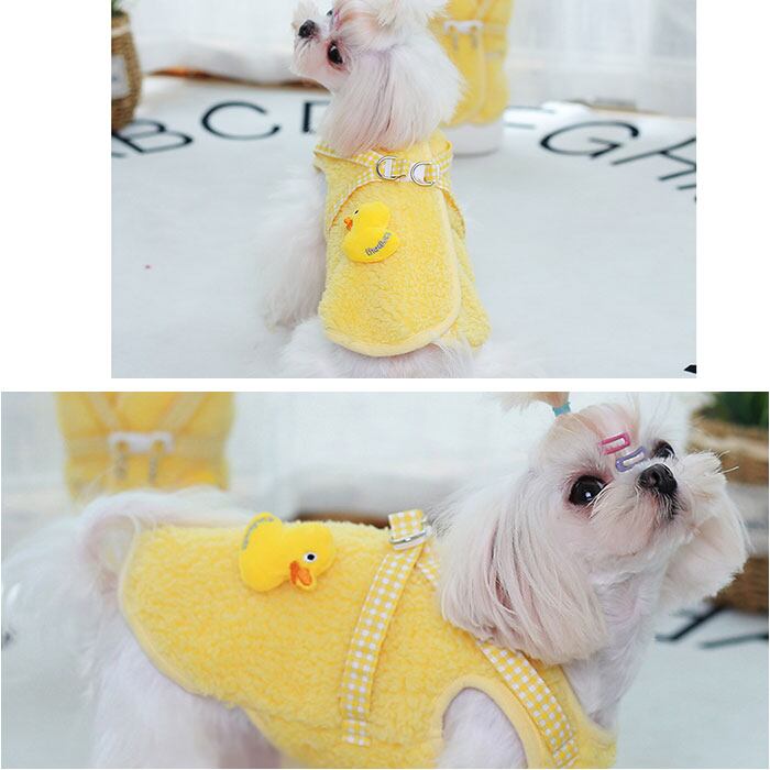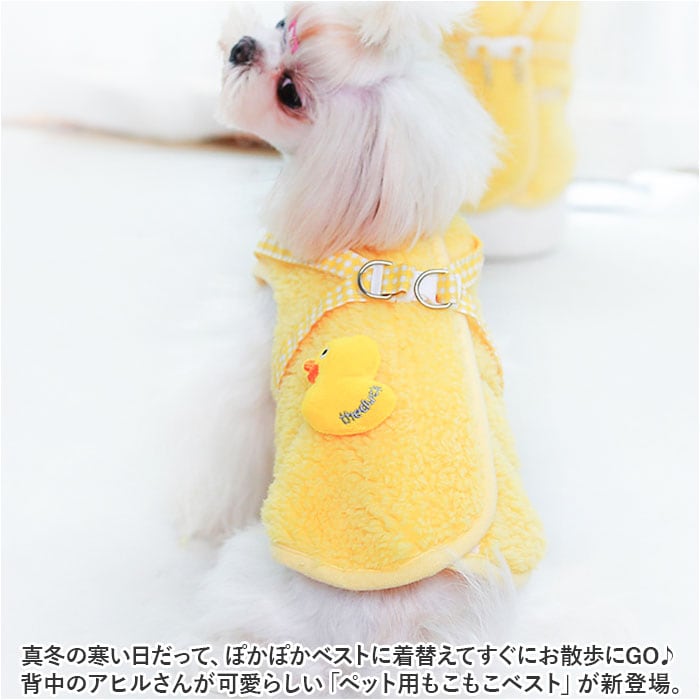 ・真冬の寒い日だって、ぽかぽかベストに着替えてすぐにお散歩にGO♪背中のアヒルさんが可愛らしい「ペット用もこもこベスト」が新登場。