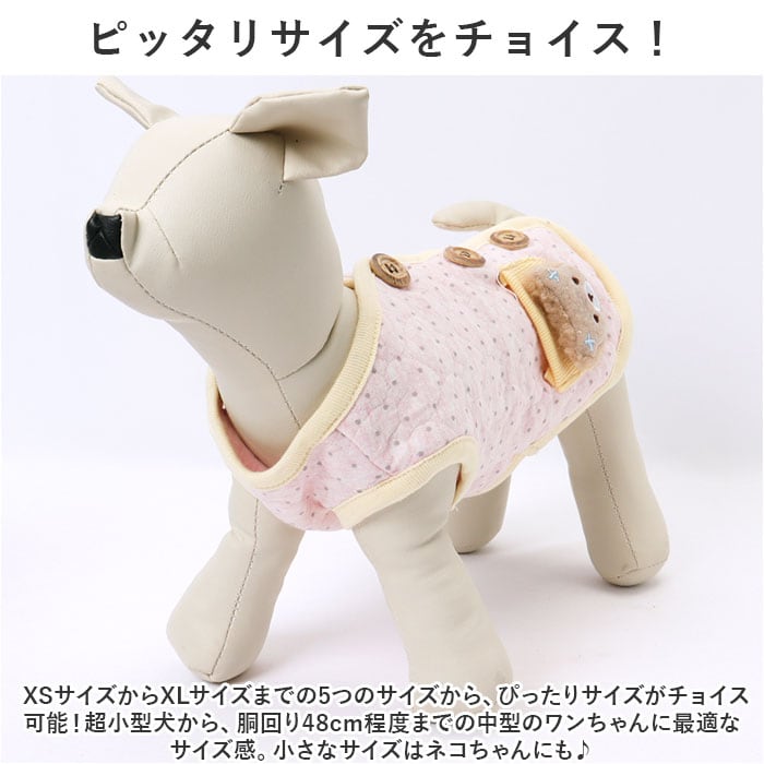 ・XSサイズからXLサイズまでの5つのサイズから、ぴったりサイズがチョイス可能!超小型犬から、胴回り48cm程度までの中型のワンちゃんに最適なサイズ感。小さなサイズはネコちゃんにも♪