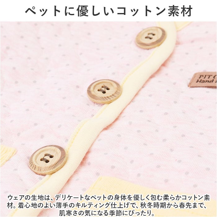 ・ウェアの生地は、デリケートなペットの身体を優しく包む柔らかコットン素材。着心地のよい薄手のキルティング仕上げで、秋冬時期から春先まで、肌寒さの気になる季節にぴったり。