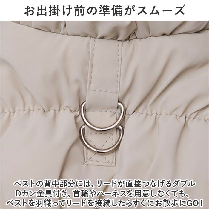 ・ベストの背中部分には、リードが直接つなげるダブルDカン金具付き。首輪やハーネスを用意しなくても、ベストを羽織ってリードを接続したらすぐにお散歩にGO!