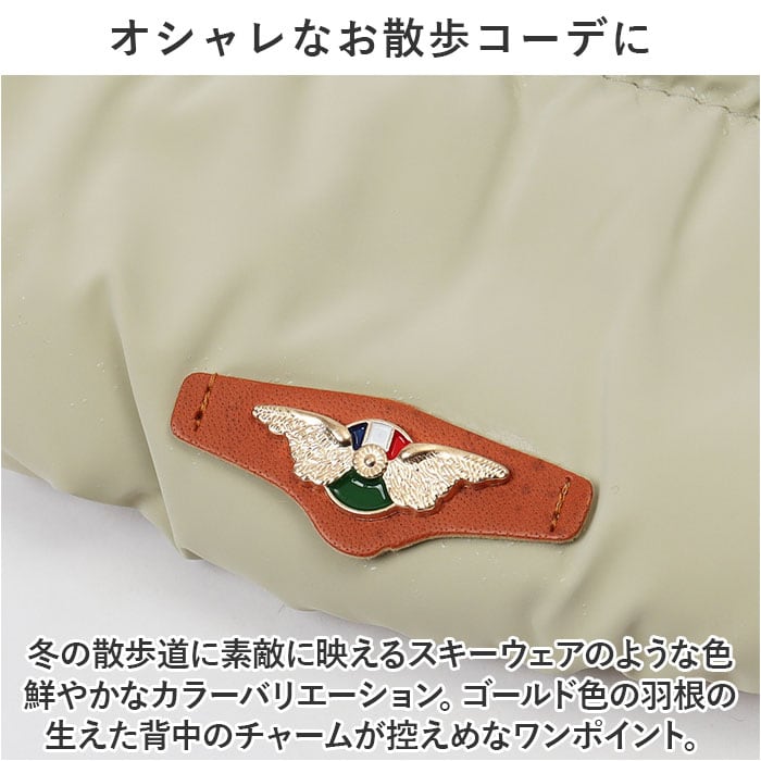 ・冬の散歩道に素敵に映えるスキーウェアのような色鮮やかなカラーバリエーション。ゴールド色の羽根の生えた背中のチャームが控えめなワンポイント。