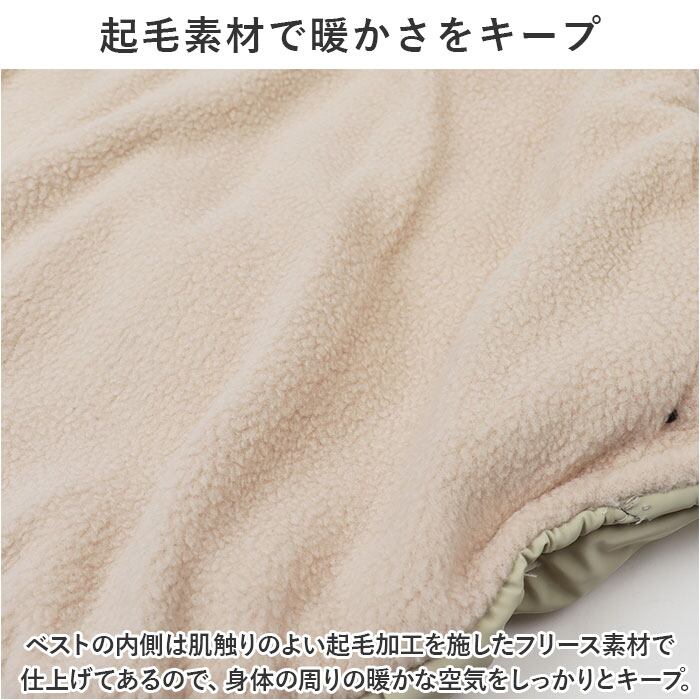・ベストの内側は肌触りのよい起毛加工を施したフリース素材で仕上げてあるので、身体の周りの暖かな空気をしっかりとキープ。