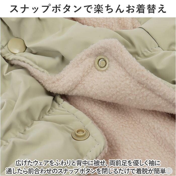 ・広げたウェアをふわりと背中に被せ、両前足を優しく袖に通しから前合わせのスナップボタンを閉じるだけで着脱が簡単なデザイン。