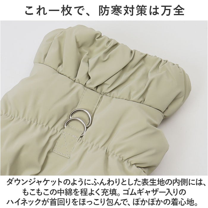 ・ダウンジャケットのようにふんわりとした表生地の内側には、もこもこの中綿を程よく充填。ゴムギャザー入りのハイネックが首回りをほっこり包んで、ぽかぽかの着心地。