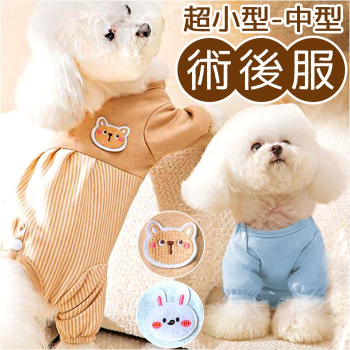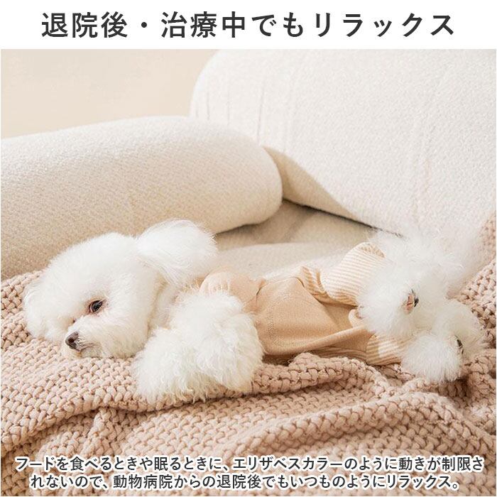 ・去勢手術や避妊手術の後や、皮膚疾患などで治療中のペットが、患部を舐めてしまったり、噛んでしまうことを防ぐ術後服タイプのペットウェア。