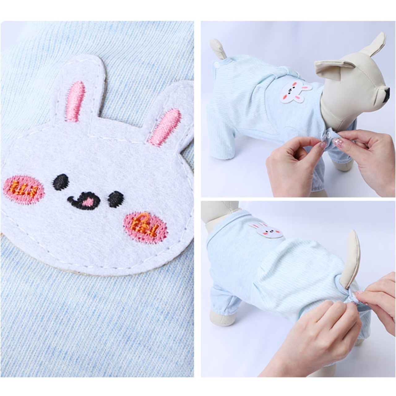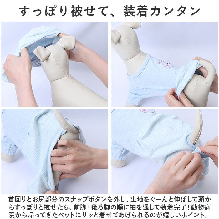 ・首回りとお尻部分のスナップボタンを外し、生地をぐーんと伸ばして頭からすっぽりと被せたら、前脚・後ろ脚の順に袖を通して装着完了!動物病院から帰ってきたペットにサッと着せてあげられるのが嬉しいポイント。