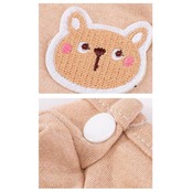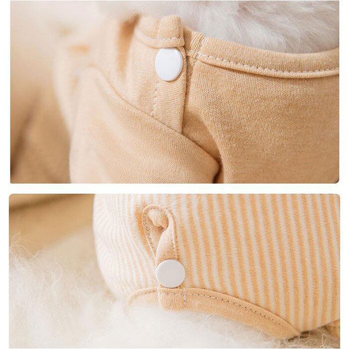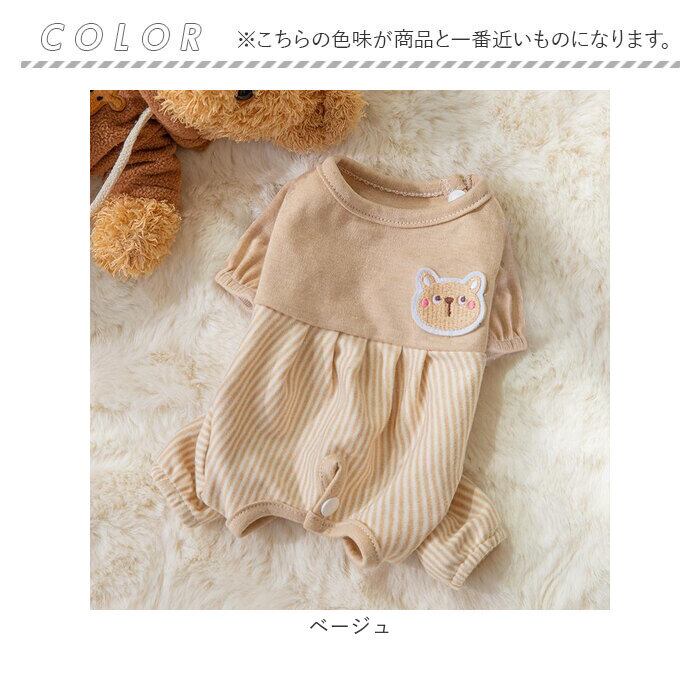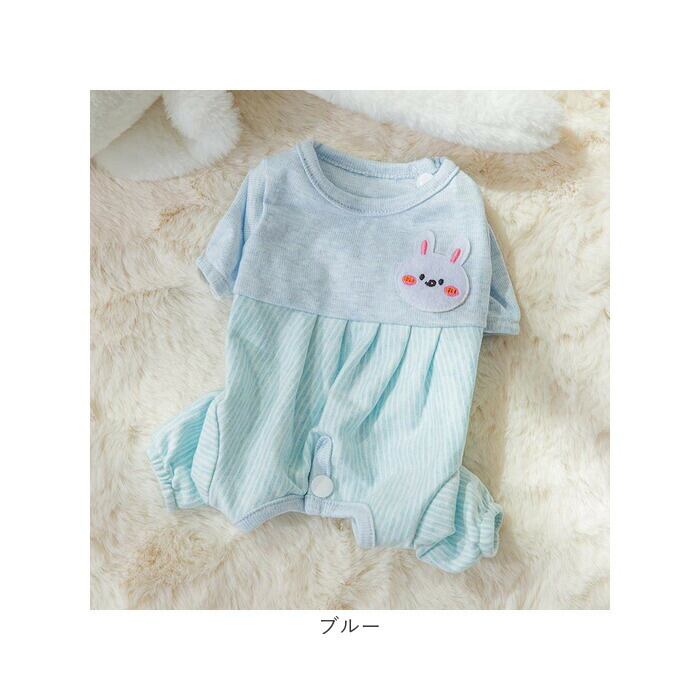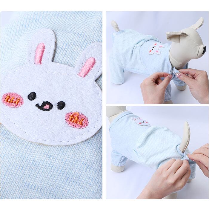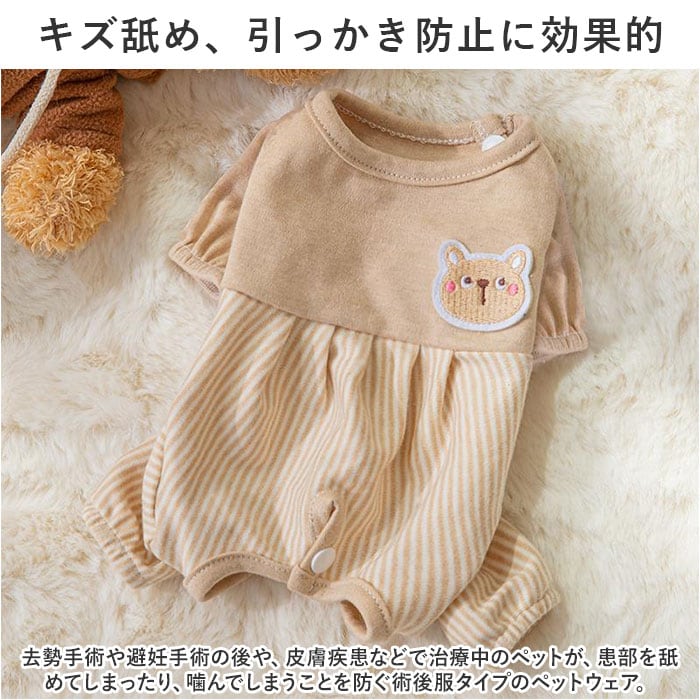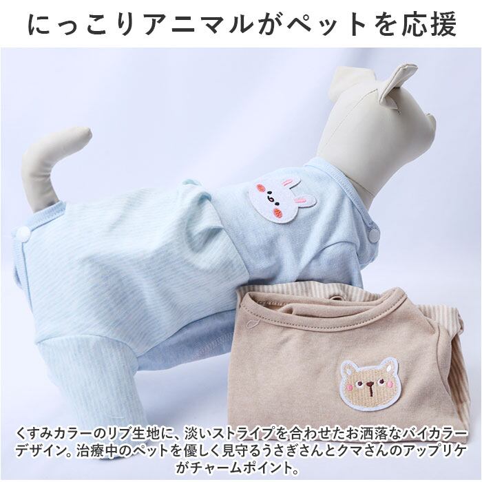 ・くすみカラーのリブ生地に、淡いストライプを合わせたお洒落なバイカラーデザイン。治療中のペットを優しく見守るうさぎさんとクマさんのアップリケがチャームポイント。