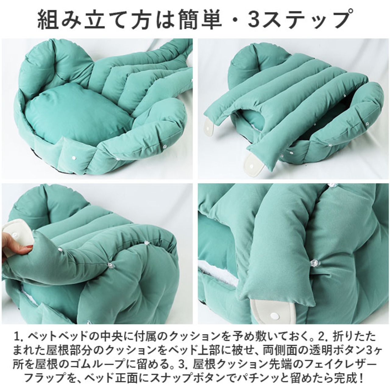 2.折りたたまれた屋根部分のクッションをベッド上部に被せ、両側面の透明ボタン3ヶ所を屋根のゴムループに留める。