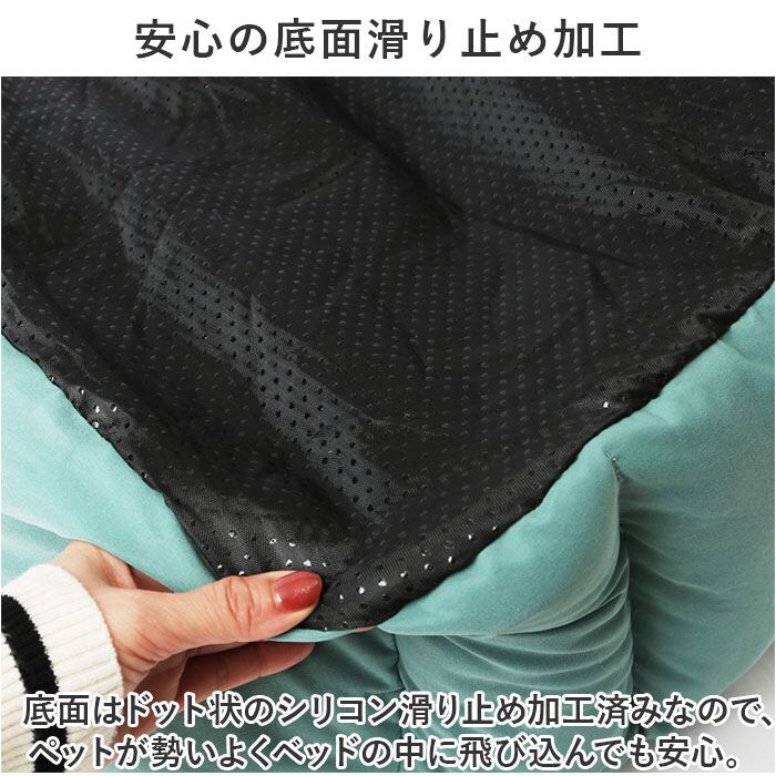 ・底面はドット状のシリコン滑り止め加工済みなので、ペットが勢いよくベッドの中に飛び込んでも安心。