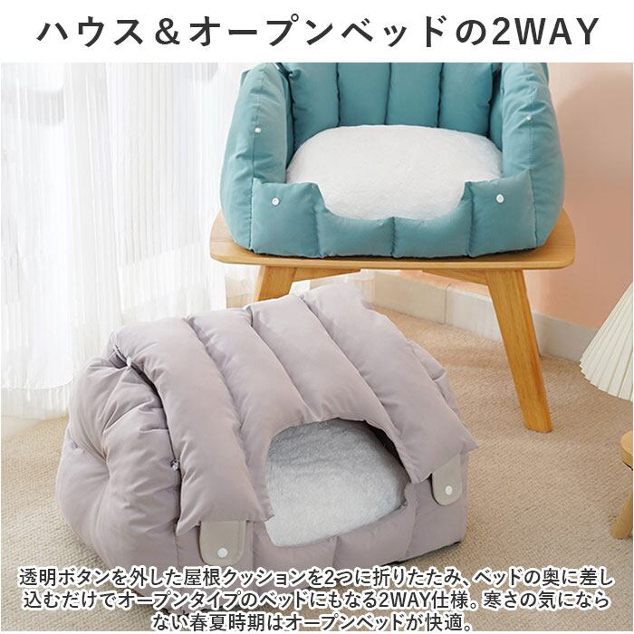 ・ふわふわベッドにすっぽり潜りこんで、すやすや快適お休みタイム。ベッドにもペットハウスにもなる「ふわふわペットベッド」が新登場。