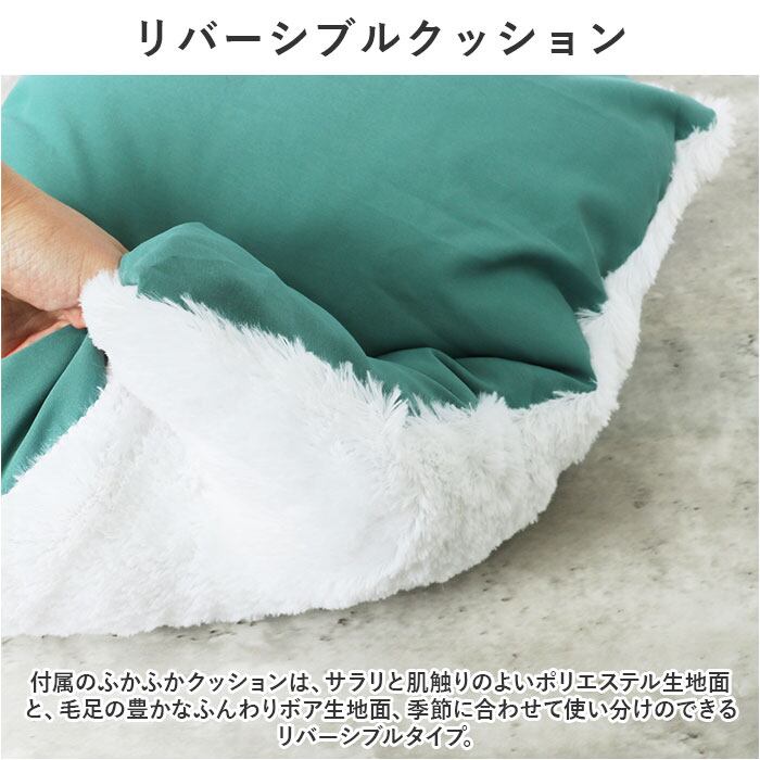 ・付属のふかふかクッションは、サラリと肌触りのよいポリエステル生地面と、毛足の豊かなふんわりボア生地面、季節に合わせて使い分けのできるリバーシブルタイプ。